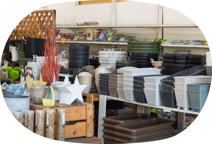 プラスチック鉢やガーデングローブ、シャベルなど